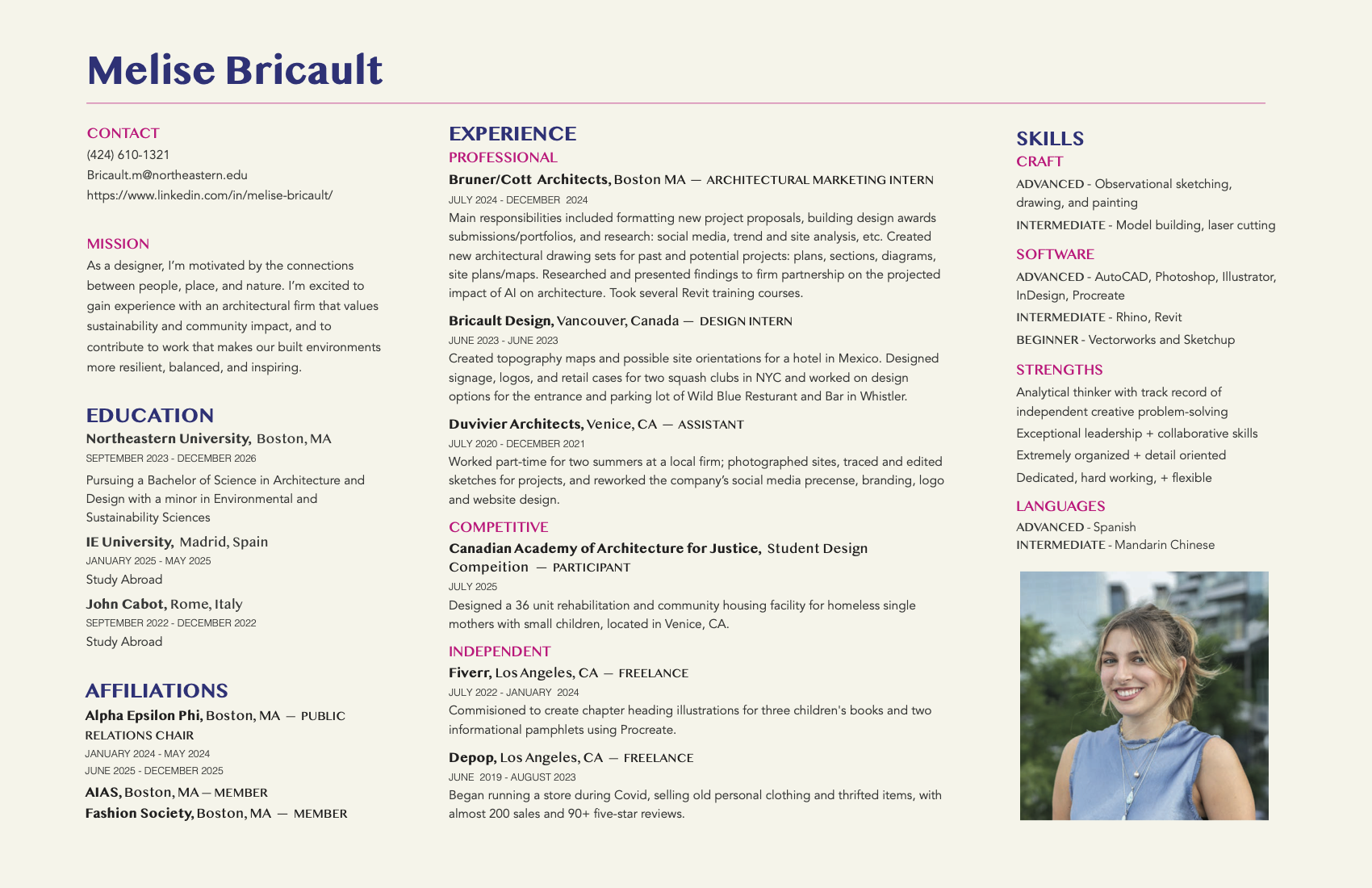 Senior undergraduate student at Northeastern University studying Architecture, Design, and Environmental Science.
